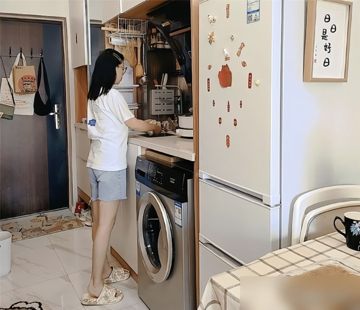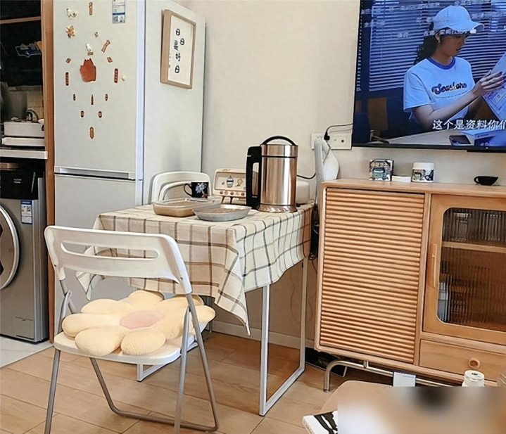 最聪明的是折叠餐桌,挤在冰箱旁边,不用的时候收起来,省出的空间能放个小推车装零食——你说这是“凑活”?明明是“把空间掰成两半用”!独居的快乐不就是这样吗?不用迎合别人的餐桌尺寸,不用为了“客人来吃饭”留个大桌子,自己想怎么来就怎么来,连“省出来的地方”都能装下小贪心。